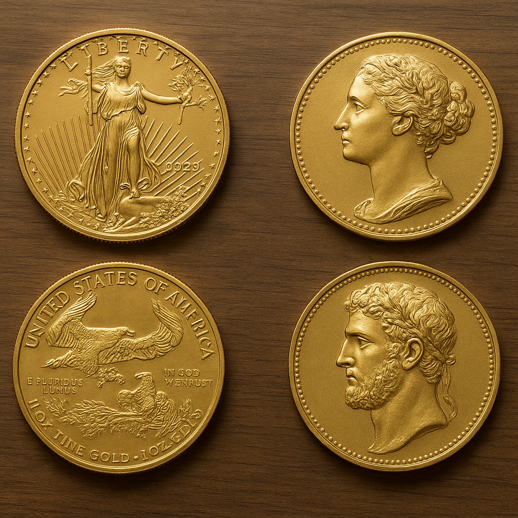 - Typowość: charakterystyczny wzór (np. Krugerrand, Maple Leaf, American Eagle).